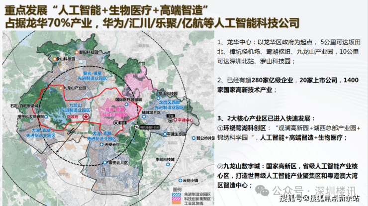 观澜占据龙华70%产业,鹭湖中心城与九龙山数字城双核驱动,聚焦人工智能、生物医疗、高端智造等高新技术产业;