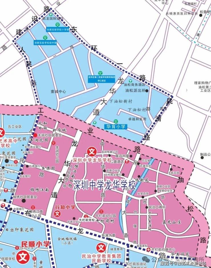 划分范围:民治街道(除单校划片学区外)和龙华街道东环一路以南、民清路以西、工业路以北、人民路以东、建设路以东(蓝色虚线框)范围。