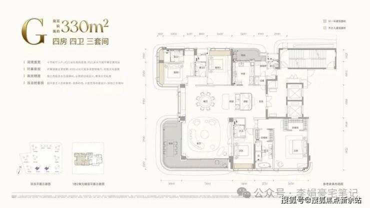 约330㎡(四房四卫三套间):堪称“前海湾户型之王”。约21米东南向环幕阳台、7.4米阔厅、双总统套房尺度主卧,并配备独立家政套间与酒窖。这是为城市峰层人物定制的空中行宫。