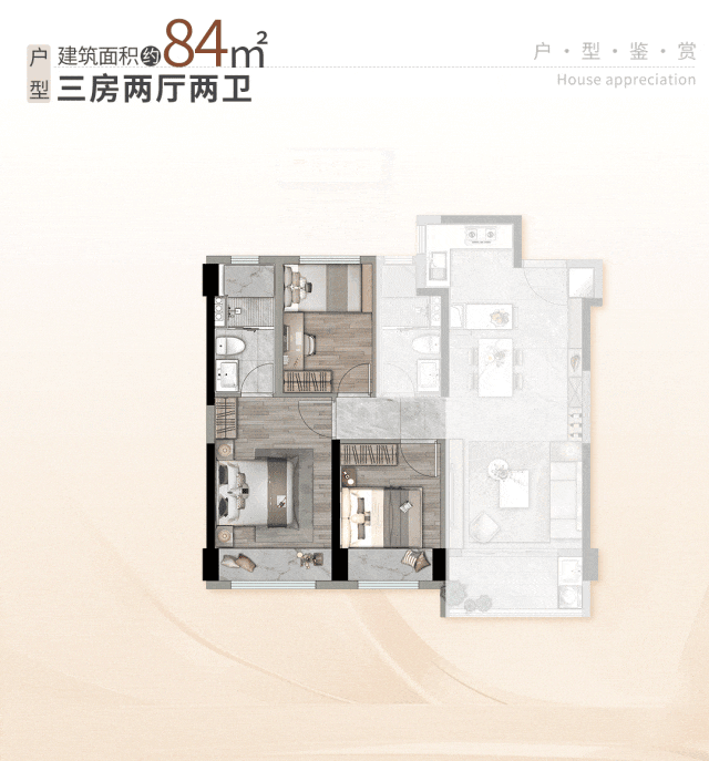 建面约84㎡三房,则是帮你将家庭打理得井井有条的生活管家。