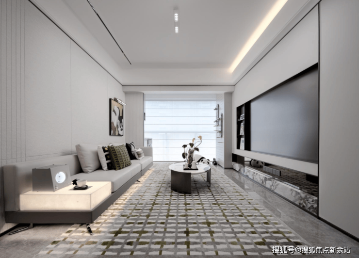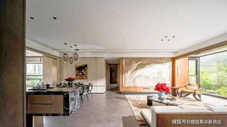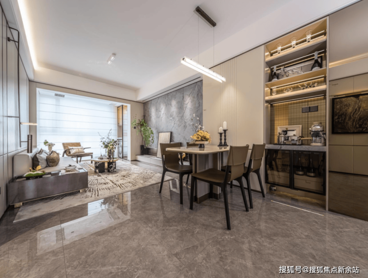 约30㎡客餐厅阳台奢阔公区,打造出三代人的自由区:孩子在地毯搭乐高,你在沙发追剧,老人阳台浇花,三代人互不打扰又能随时对话。