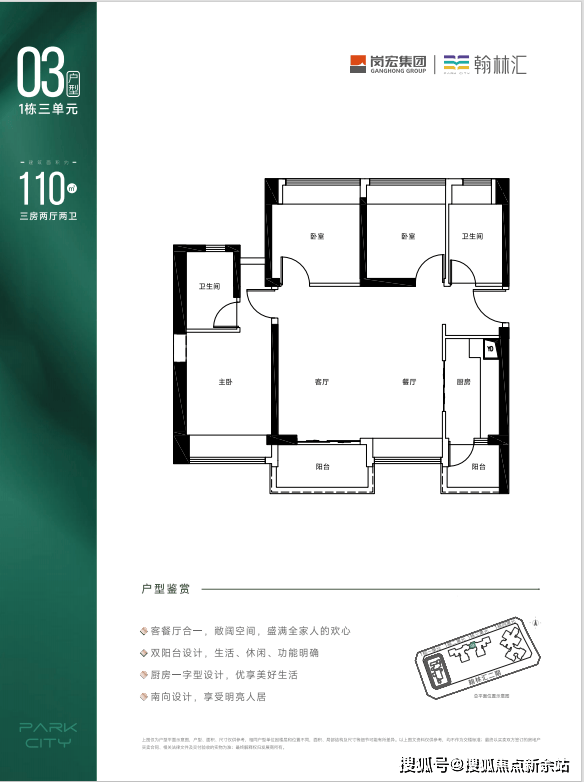 110㎡ 03户型3房2卫横厅设计,客餐厅一体化,厨房一字型设计,洗切炒黄金动线,四开间朝南,厨房带一个生活阳台,设计双阳台,室内通透;1栋3单元东南朝向。