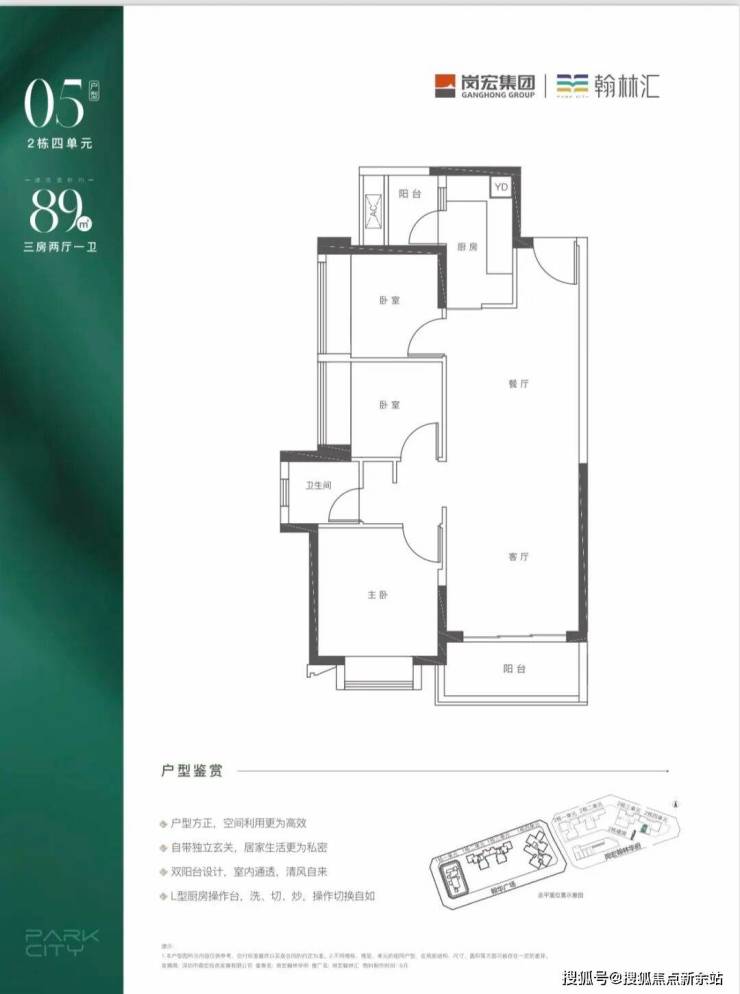 89㎡ 05户型3房2厅1卫经典竖厅设计,客餐厅一体化,L型厨房洗切炒黄金动线,动静分区,生活娱乐互不干扰,带一个生活阳台,设计双阳台,室内通透;2栋4单元西南朝向。