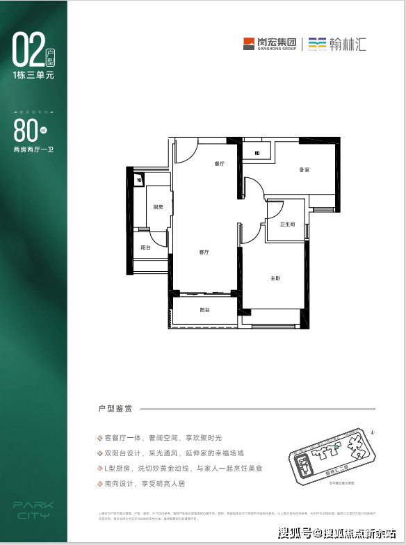 80㎡ 02户型2房2厅1卫经典竖厅设计,客餐厅一体化,L型厨房洗切炒黄金动线,动静分区,生活娱乐互不干扰,带一个生活阳台,设计双阳台,室内通透;1栋3单元朝南向。