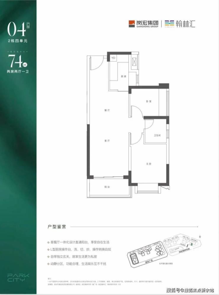 74㎡ 04户型2房2厅1卫经典竖厅设计,超长玄关鞋柜,L型厨房,动静分区,生活娱乐互不干扰;2栋4单元西南朝向。