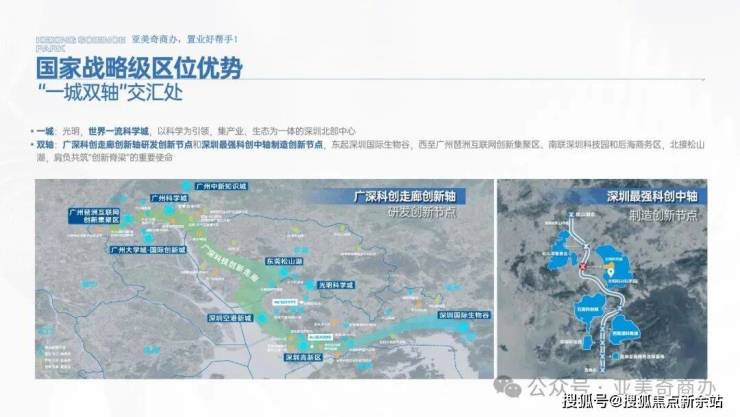 双轴:广深科创走廊创新轴-研发创新节点和深圳最强科创中轴-制造创新节点,东起深圳国际生物谷,西至广州琶洲互联网创新集聚区、南联深圳科技园和后海商务区,北接松山湖,肩负共筑“创新脊梁”的重要使命