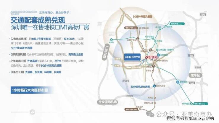 项目位于光明6号线长圳地铁站旁。玉塘街道位于光明区的最南面,离南山地缘最近,面积占光明区的13%,聚集了光明1/3的产业。通过深圳最强科创中轴线的链接,将加速两地产业、人才的互联互通。