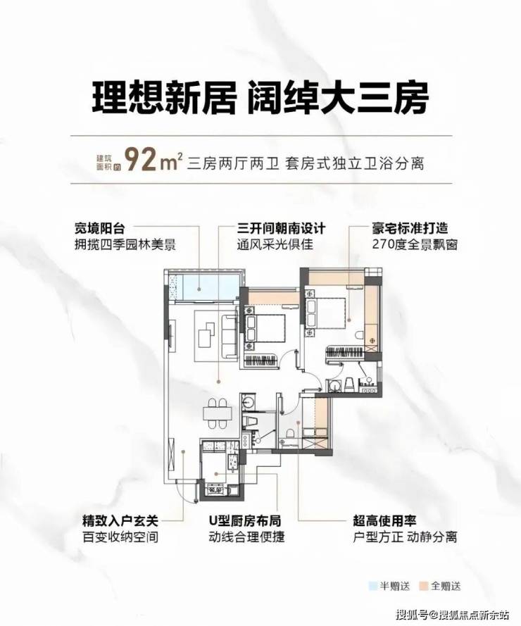 92㎡的3房2厅2卫,设计的是经典竖厅格局,客厅实测3.25米开间,LDKB一体化设计,三开间朝南,分别做到主卧15.32m²/次卧9.15m²/次卧5.57m²(实测面积),主卧270°转角飘窗,L型厨房,公卫三段式分离,得房率:76.44%(不含赠送),西南或东南朝向。