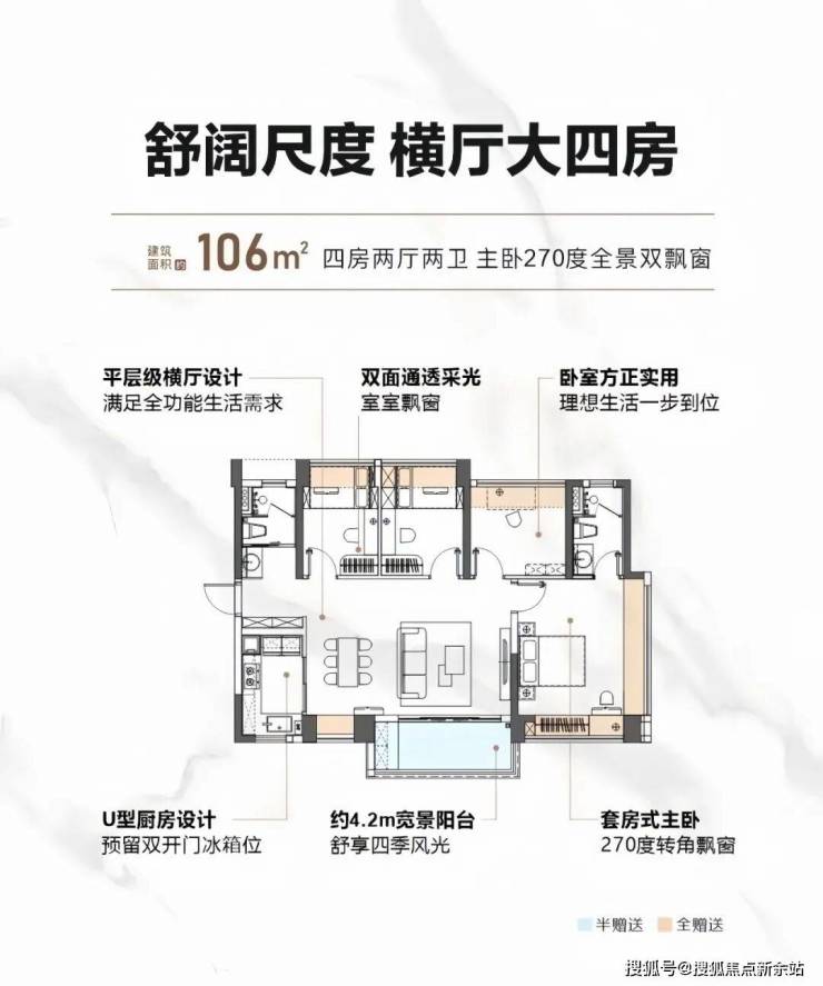 106㎡的4房2厅2卫,设计的是横厅南北通透格局,进门独立入户玄关,客餐厅6.1米开间,LDK一体化设计,分别做到主卧17.31m²/次卧7.75m²/次卧7.41m²/次卧6.92m²(实测面积),主卧270°转角飘窗,U型厨房,公卫三段式分离,得房率:76.44%(不含赠送),阳台主朝西南或东南向。