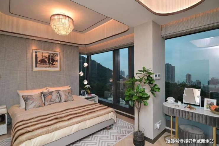主人套房空间宽敞,睡床两旁摆放床头几及床头灯,营造静谧的休息氛围,房内设广角大窗,提高采亮度,亦可将维港海景尽收眼帘。设计师将主人房及旁边客房打通作小偏厅应用,更显宽敞舒适。房内设有一组深色木纹高身衣柜及梳妆枱。