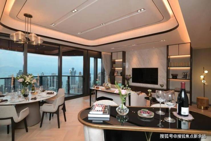 大厅划分成3个空间,分别为电视区、饭厅区及吧枱区。客厅墙身配以云石设计,并铺砌人字纹木地板,配上浅褐色梳化、灰色压纹地毡及云石茶几,并与露台相接,空间感大增。落地玻璃趟门设计,令室内可广纳自然光线,亦可将窗外维港景致尽收眼底。饭厅用上特色玻璃吊灯,提升空间深度和亮泽感,并放置了云石纹理枱面6人圆形餐桌,另一端墙身则以玻璃镜面设计,放置金色层架作酒柜,另摆放云石纹理枱面吧枱和灰色布面座椅,展现时尚风格。