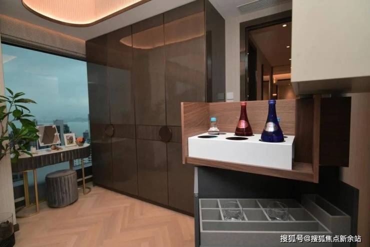 至于经设计师改动的书房,设偌大的窗户,书桌贴靠窗边而置,广纳自然光线,又可欣赏维港景致。书房摆有放入墙书柜及黑色装饰层,缀以别致的装饰,兼备收纳及装饰之效。