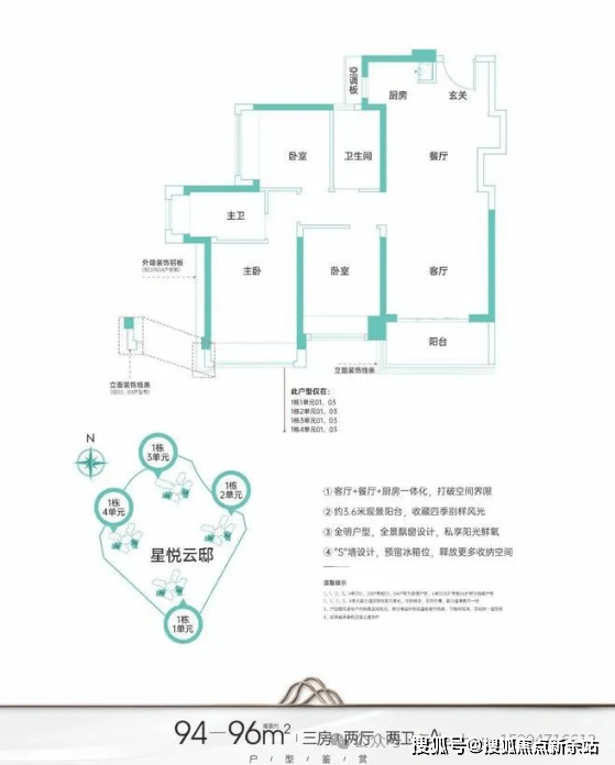 建面约95㎡三房两卫:全明设计、户型方正,明厨两厅,通风采光效果好。入户玄关设计宽敞,户内采用行业创新的S墙设计,功能性极强。客餐厅一体化设计,空间更显阔绰。主卧为尊崇套房设计,配备超大采光面及独立卫浴。