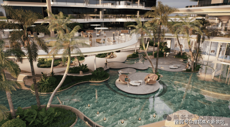 邱德光设计岛心多维共享空间,如社区“灯塔”,以蔚蓝泳池为视觉心脏,用拱廊构建地中海式或南洋风情社交氛围,涵盖恒温泳池、宴会厅、雪茄室、瑜伽室、咖啡厅、茶室等塔尖社交场域。