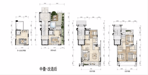 中叠以131平方米建面打造约300平方米的实际可用空间,实用率高达200%。这栋共4层的叠墅,位于地上一、四、五层和地下一层,与中式传统建筑风格相得益彰。其中一层北向花园和会客厅,四层则是餐厅、厨房和一间卧室,三层则规划了休息区,共有3间卧室。两个归家路线设计使出入更为便捷,让居民享受方便的生活方式。