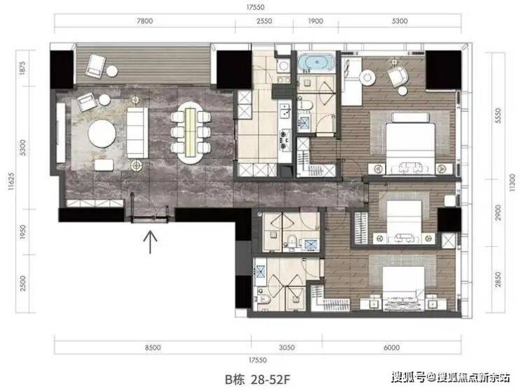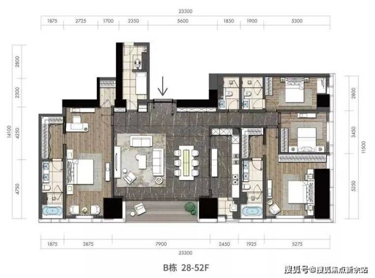 所有340㎡户型位于B栋28-52F正东朝向,23米观海面,向海而生,无言的霸气。
