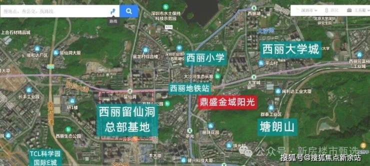 鼎胜金域阳光家园西侧为 西丽留仙洞总部基地,东北侧为 大学城,东侧为 塘朗山,西南侧是 西丽高铁站。