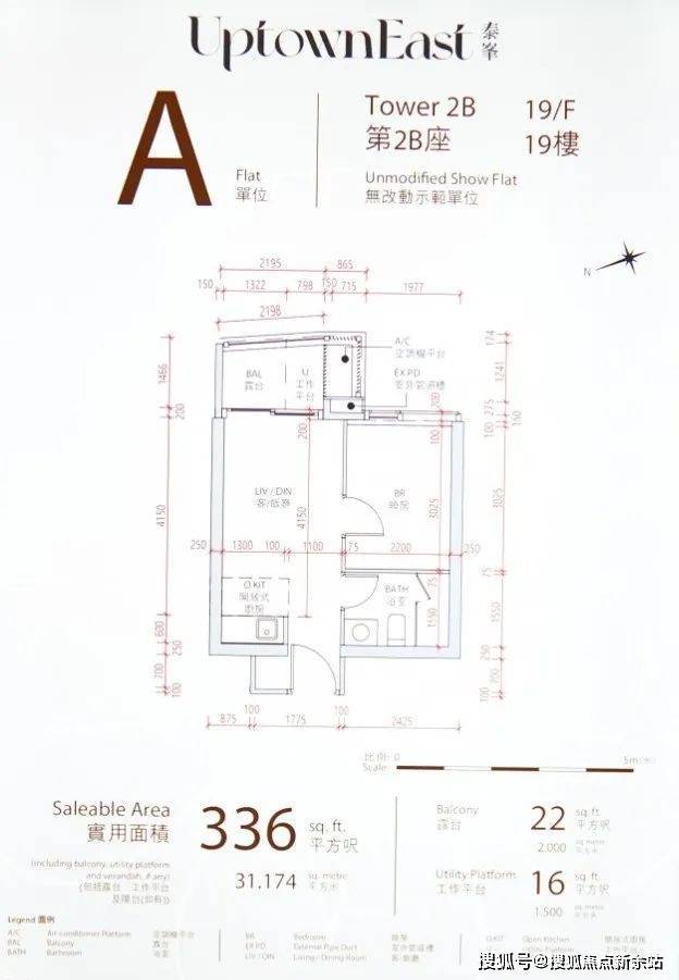 2B座19楼A室(336尺1房单位)