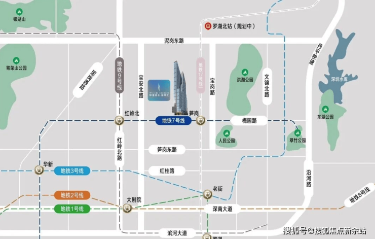 无缝接驳地铁7号线笋岗站D出口(已开通),地铁17号线笋岗站正在规划中,邻9号线红岭北站。