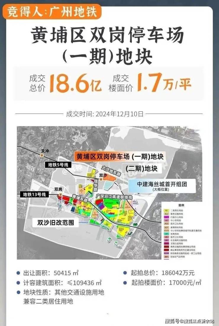 2024年12月10日,黄埔双岗停车场地块一期正式竞价,广州地铁以底价186042万元拿下,成交楼面价约1.7万/平。