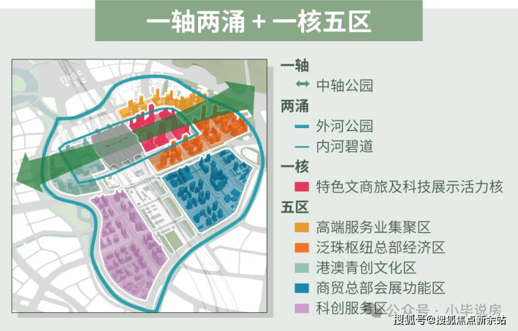 广州南站核心区占地4平方公里,相当于3/4珠江新城,规划总建筑面积(计容) 853万平方米。空间布局分为“一轴两涌+一核五区”。