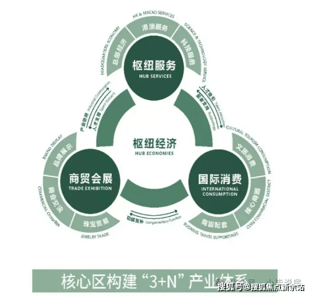以枢纽服务、国际消费、商贸会展3大开放型综合产业为引擎,衍生N个创新服务型业态。依托交通枢纽优势,打造未来枢纽经济区特性的城市公共和建筑空间,协同发展的高品质产业生态圈。