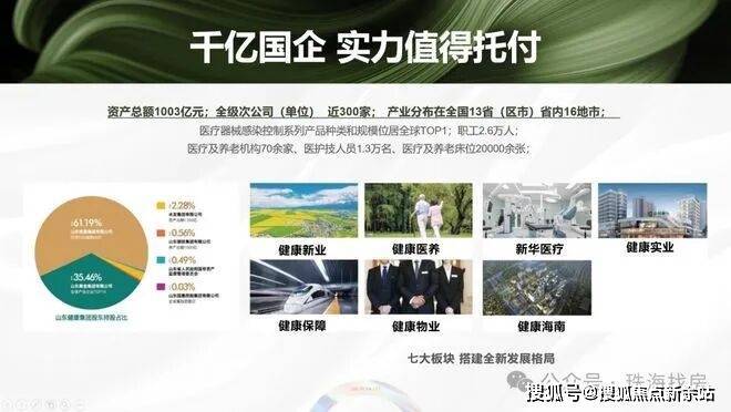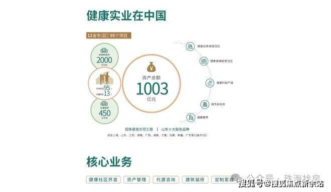 旗下健康实业进驻上海、山东、广东、海南、新疆等12省(市),开发项目95个,荣获中国品牌房地产100强,省属国有企业中最大康养地产开发企业等荣誉资质。打造国家康居示范工程,国匠实力,值得托付。