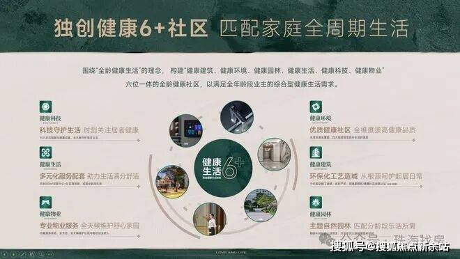 围绕“全龄健康生活”的理念,构建“健康建筑、健康环境、健康园林、健康生活、健康科技、健康物业”六位一体的全龄健康社区,以满足全年龄段业主的综合型健康生活需求。