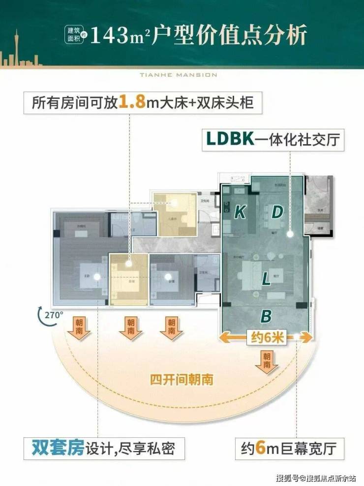 以打造新派科技住宅为目标,引入华为智能系统,实现智能化生活,通过智能中控一屏控制适配设备,并具备无限扩展应用子系统的潜力。建筑设计上,采用科技光幕美学外立面,错落有致的天际线不仅提升美观度,还保证优越采光和宽阔观景视野。3.0m/3.3m 层高搭配 270° 景观大飘窗,营造奢阔空间感。LDKB 方厅设计,部分户型直连超 6m 阳台,增强空间互动性与实用性。社区规划上,打造双泳池会所,采用酒店式环岛落客设计,营造国际仪式感;园林设置 FUN 享客厅、草坪剧场等多重景观空间,满足居民休闲娱乐需求。