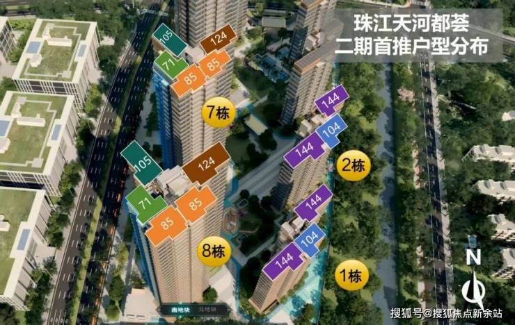 珠江・天河都荟由珠江实业集团、广州城投集团、天河投资集团三大国企强强联手打造,品质值得信赖。项目位于天河中轴智慧城芯,占地面积约 5.5 万㎡,计容建面约 11.5 万㎡ ,二期容积率约 2.5,以低至 14 层的小高层为主,户户朝南,打造低密奢境。首推约 71 - 144㎡全南向新规产品,空间设计合理,使用率高,兼具科技感与舒适度。