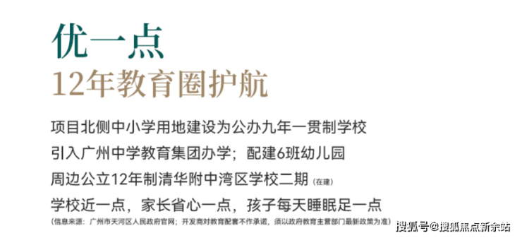教育资源丰富且优质,项目北侧教育用地将建设公办九年一贯制中小学,并引入广州中学教育集团办学。同时配建 6 班幼儿园,旁边还有 12 年制清华附中湾区学校二期(在建中,预计 2026 年完工),形成全龄段优质教育圈,为孩子成长提供有力保障。