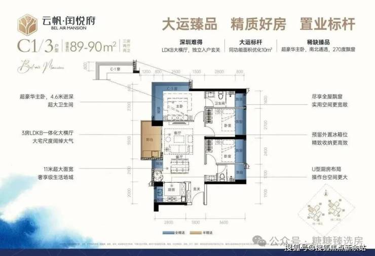 89㎡3房2厅2卫:设计的是经典横厅格局,LDKB一体化,进门入户玄关,客厅带3.5米阳台,U型厨房,主卧南北通透270度景观,卫生间干湿分离。