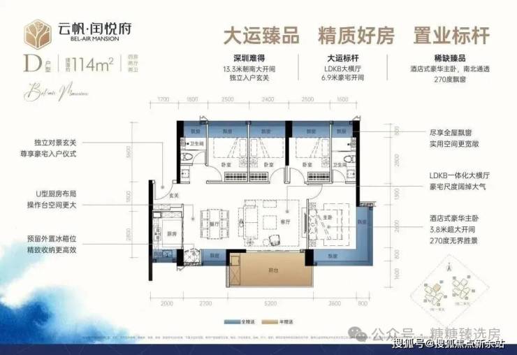 114㎡4房2厅2卫:设计的是经典大横厅格局,LDKB一体化6.9米开间,进门入户玄关,客厅带5.2米大阳台,U型厨房,主卧南北通透270度景观,卫生间干湿分离。