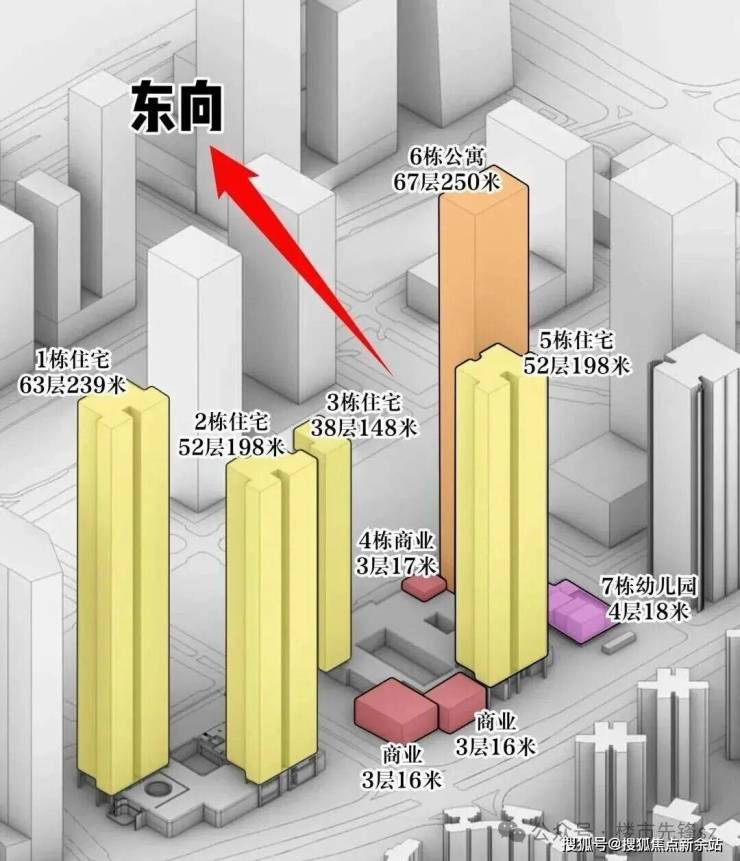 项目由五栋塔楼组成,高度介于150米至250米,分为南北两个地块。北区为两栋住宅,南区包括两栋住宅及一栋公寓,配套一所幼儿园。总车位约1800个,南北区车库独立。容积率约7,但因户型面积较大,整体居住密度可控。