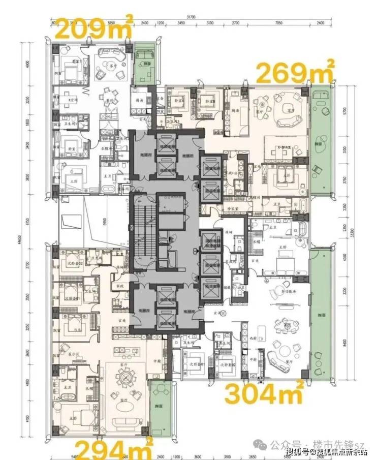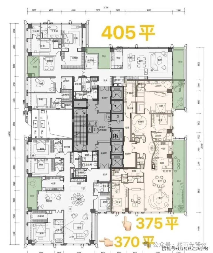 ②高区42F起(150-200米)是约370-375-403㎡4+1房五卫+家庭厅+家政套间;