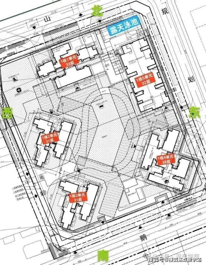 共由5栋总高31-38层的住宅组成,其中1栋1单元住宅33F,1栋2/3单元住宅31F,1栋4单元住宅38F,1栋5单元公租房32F,小区地下车库配建有公交首末站。