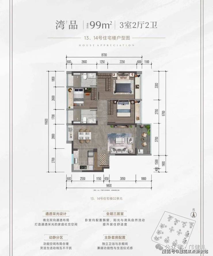 改善细节:大面宽阳台、主卧套房设计、明厨明卫。