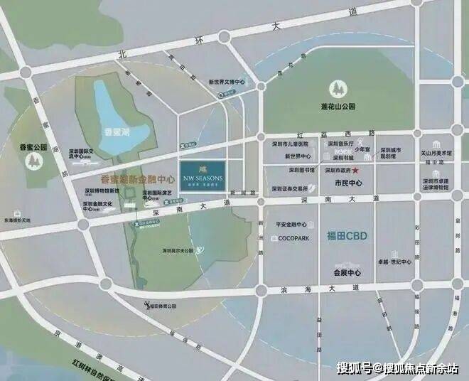 新世界香蜜四季家园位于香蜜湖新金融中心附近,按照目前规划,香蜜湖新金融中心主要分为北区和中区,中区未来将规划落成深圳金融文化中心、深圳博物馆、深圳国际演艺中心三馆,北区是深圳国际交流中心。