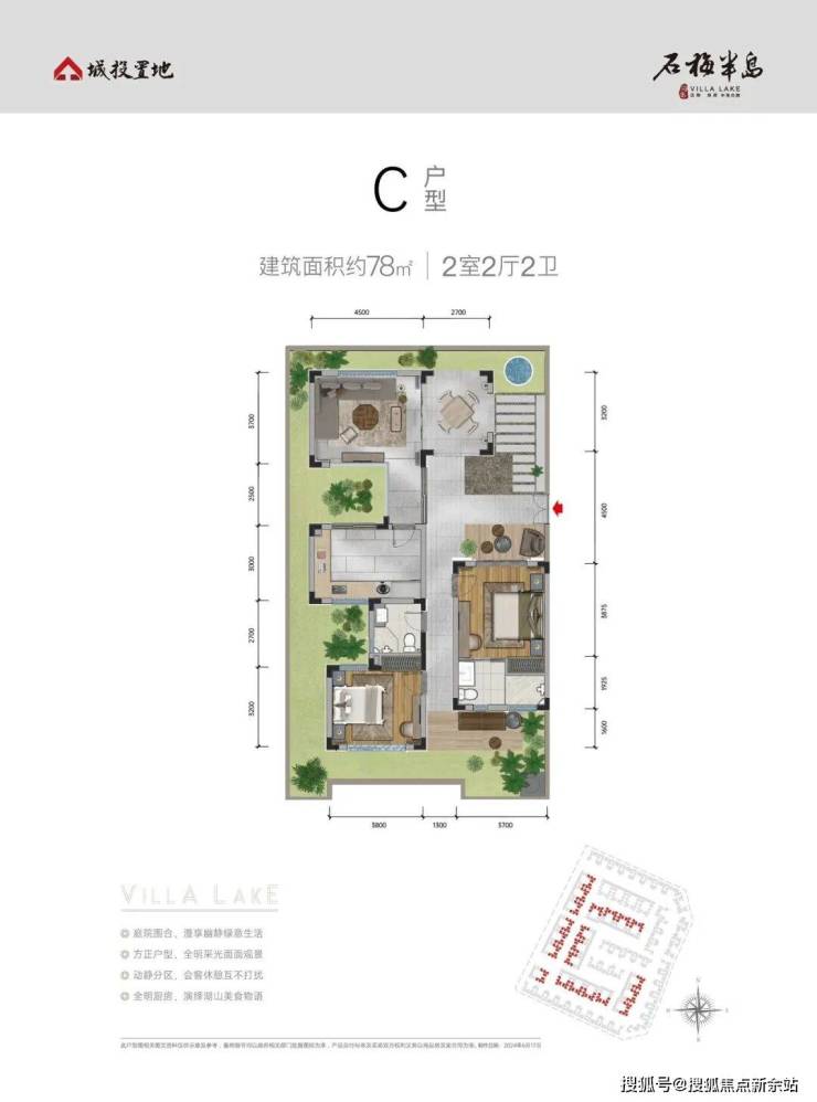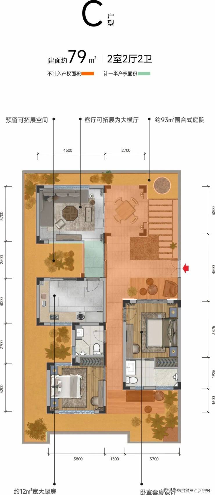 围合庭院,重塑墅居想象C户型 建面约79㎡ 2室2厅2卫院子面积约102㎡ ,实得面积约182㎡ 可拓展为三房