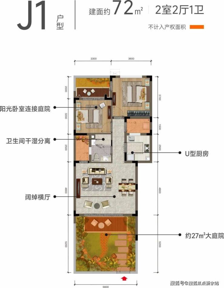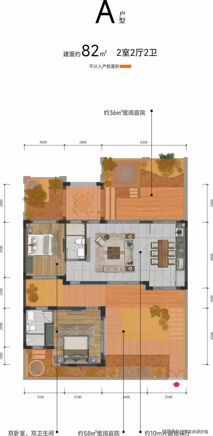 【户型鉴赏】前庭后院,丰藏旅居雅趣A户型 建面约82㎡ 2室2厅2卫院子面积约101㎡ ,实得面积约170㎡ 可拓展为三房