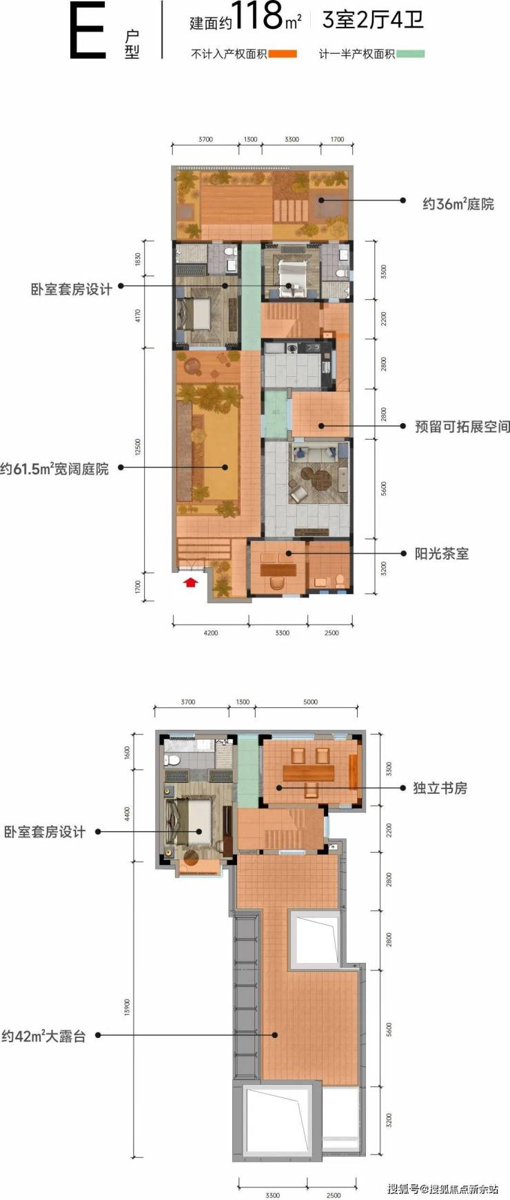 双层院墅,俯仰天地于怀E户型 建面约118㎡ 3室2厅3卫院子面积约124㎡ ,实得面积约286㎡ 可拓展为五房