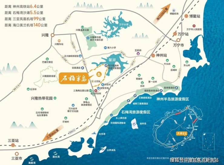 4⃣【交通】双高铁、双高速、6路公交,岛内外畅达无忧石梅半岛位于兴梅大道东侧,交通四通八达,距离博鳌机场约60公里,三亚机场约113公里,海口机场约170公里;距神州站约8.9公里,距万宁站约23公里,G98石梅、莲花双出口接入海南环岛高速,6路公交车直达万宁市区、兴隆镇区、周边各大旅游景区。