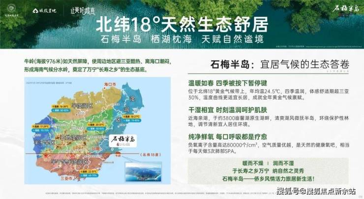 2⃣【区位】万宁兴隆,北纬18°天赋宜居胜地万宁兴隆以其独特的归侨风情、温泉度假和兴隆咖啡闻名海内外,汇聚东南亚各地风俗,文化氛围浓郁。兴隆也是长寿之乡,年均气温24.5℃,冬暖夏凉,光照充足。森林覆盖率超70%,负氧离子含量高达80000个/cm³,享清新森呼吸。