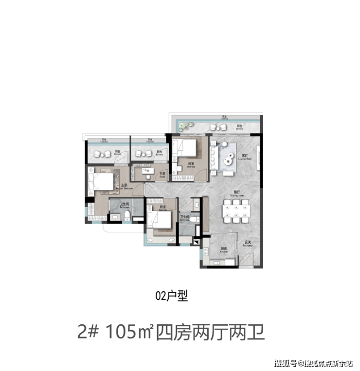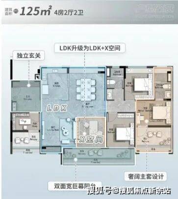 125㎡四房在舒适性上进一步提升,四开间朝南,阳台长度达到6米,连接客厅与次卧,主卧配备独立衣帽间和干湿分离卫生间,动静分区清晰,适合改善家庭 。