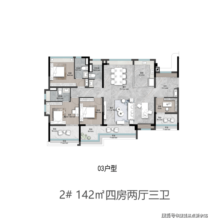 140㎡和142㎡四房则增加了功能细节,比如140㎡户型采用洄游动线设计,双主卧布局适配三代同堂,142㎡户型的双阳台分别承担观景与储物功能,实用性更强 。