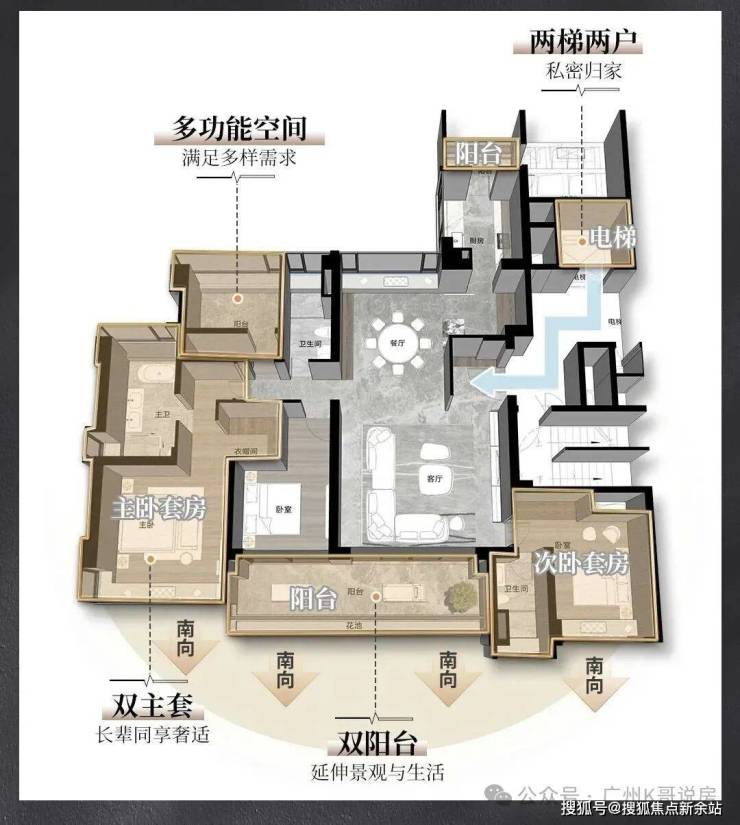 约220㎡大平层,户户四开间朝南,户户南北对流大方厅,户户两梯两户专属归家,户户双主套双阳台……