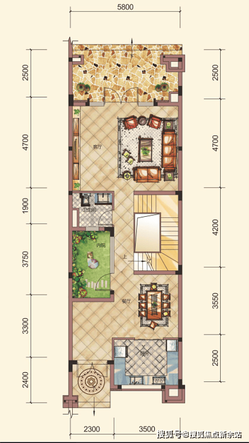 C2户型,联排别墅,5房2厅4卫,三庭院设计,5.4米开间,3.8米高大客厅,煊赫贵族气度。