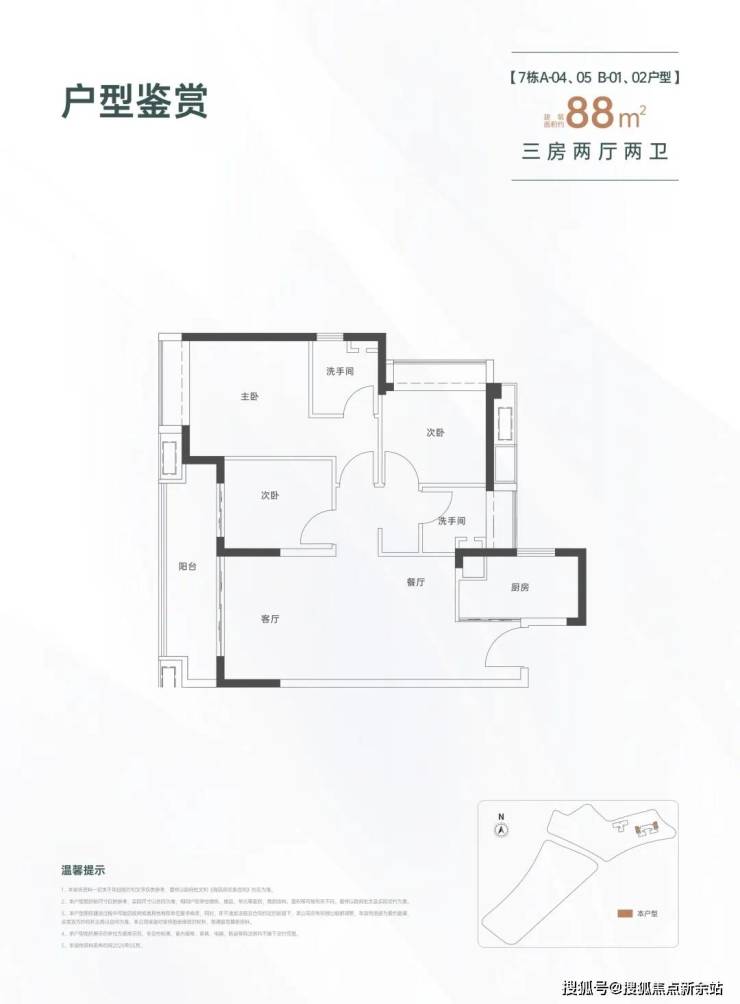 88㎡的3房2厅2卫,设计的是经典竖厅格局,进门入户玄关,LDKB一体化设计,动静分区,客厅连接次卧出大阳台,L型厨房,公卫三段式分离,得房率约82%(不含赠送),西南或东北朝向。