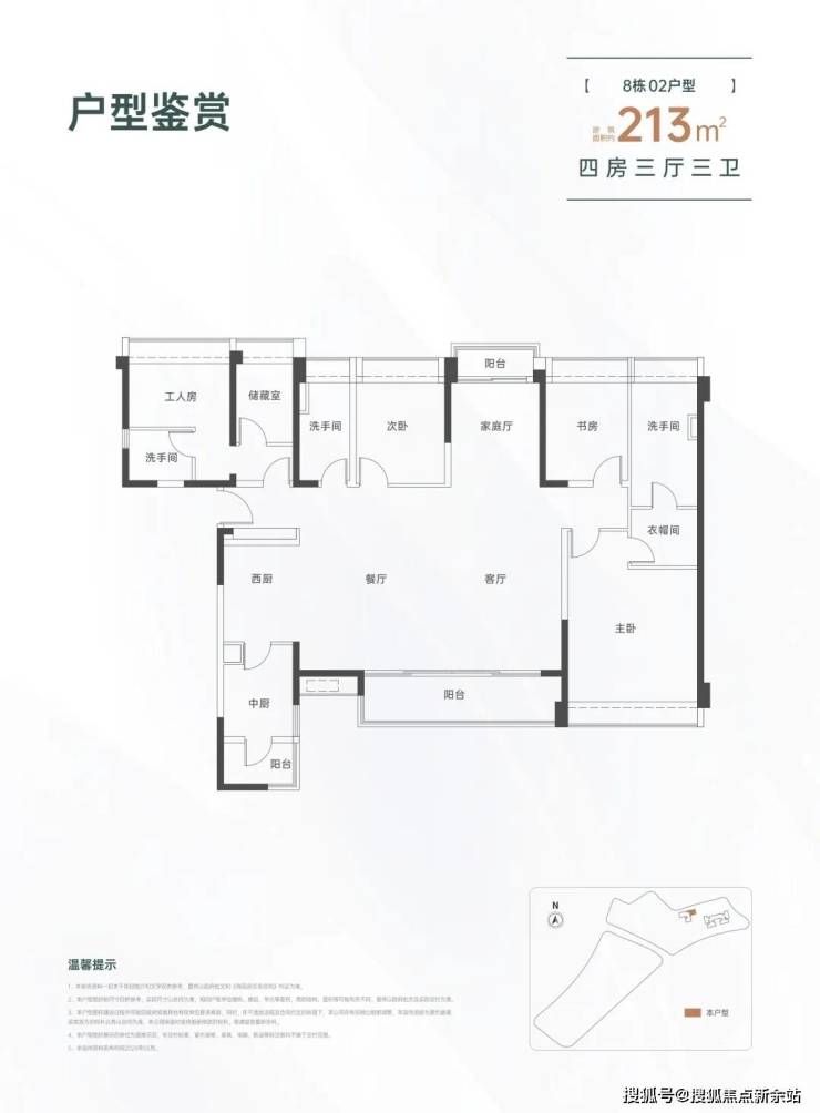 213㎡的4房3厅3卫,设计的是横厅南北通透格局,一梯一户,进门入户玄关,LDKB一体化设计,四开间朝南,双阳台通透,主卧大套间设计,还配有保姆独立套房,中西型多功能厨房,卫生间干湿分离,得房率约82%(不含赠送),阳台主朝东南向。
