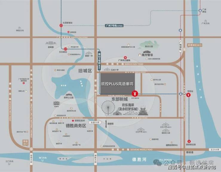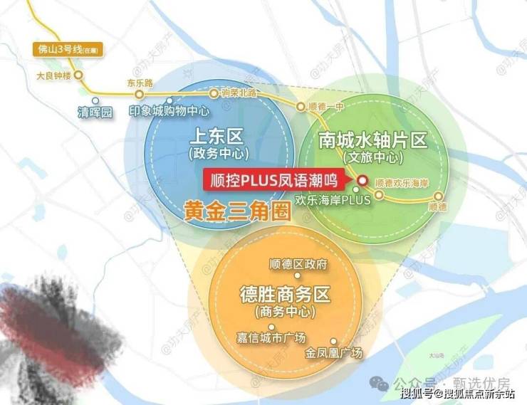 于顺德主城而言,真正的「黄金三角圈」,其实就在大良欢乐海岸周边约1公里范围内,也就是顺控PLUS·凤语潮鸣所处地段。